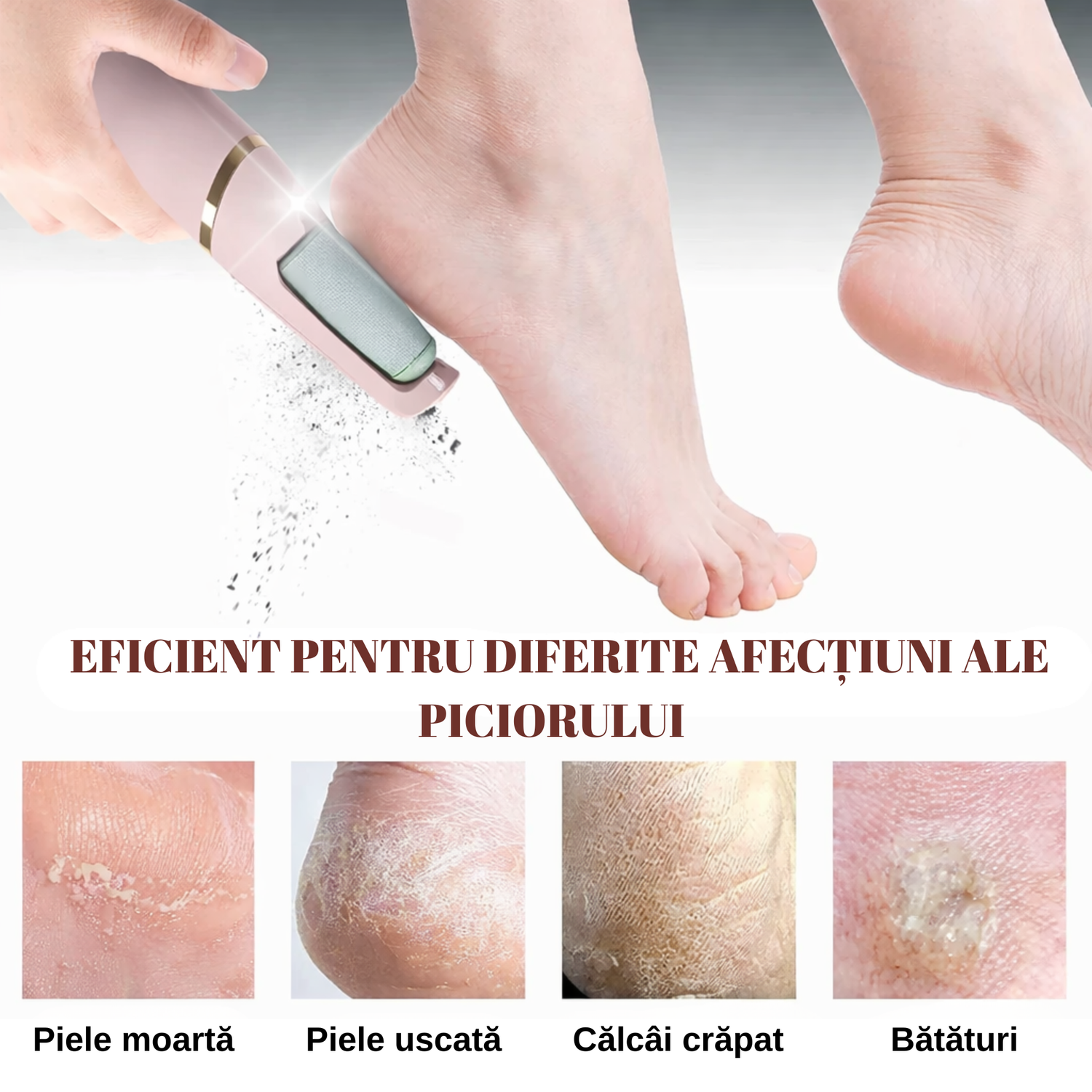 Conceput pentru a îndepărta pielea moartă, bătăturile și pielea îngroșată de pe călcâie.